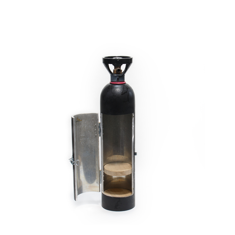 Deze borrelkast is gemaakt van een oude koolzuurfles.