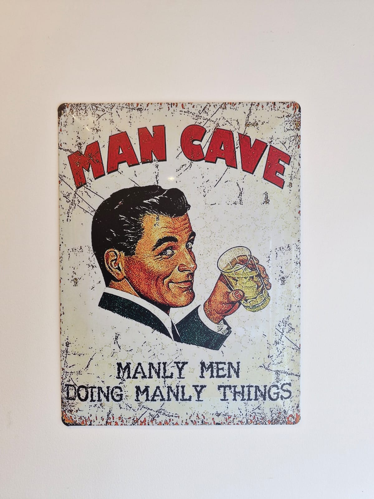 Geef jouw mancave een stoere en authentieke uitstraling met dit vintage metalen wandbord. Met de tekst “Man Cave – Manly men doing manly things” zet je direct de toon: dit is jouw plek.