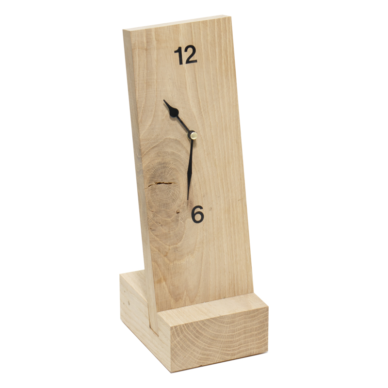 De klok is gemaakt van een eikenhouten balk die we hebben bewaard bij het slopen van een woning. Deze houten balk was onderdeel van een schouw.